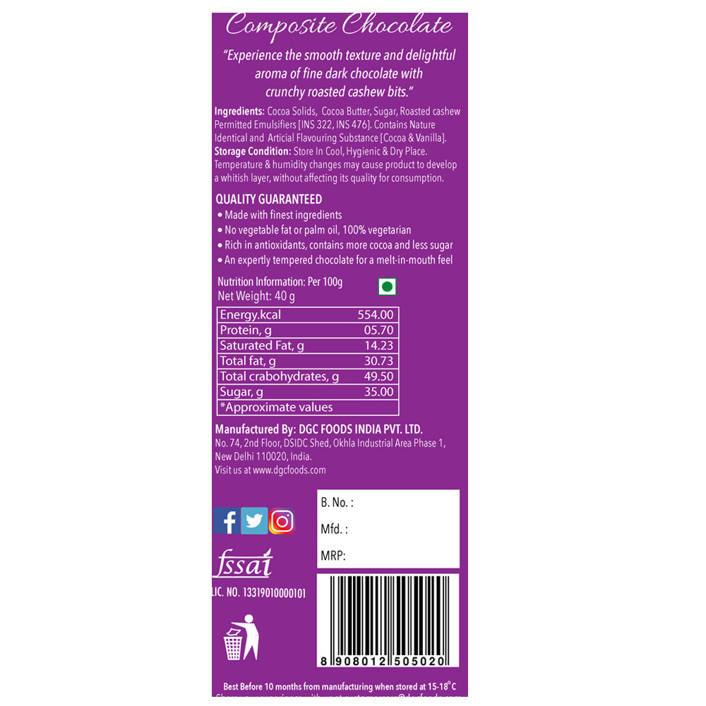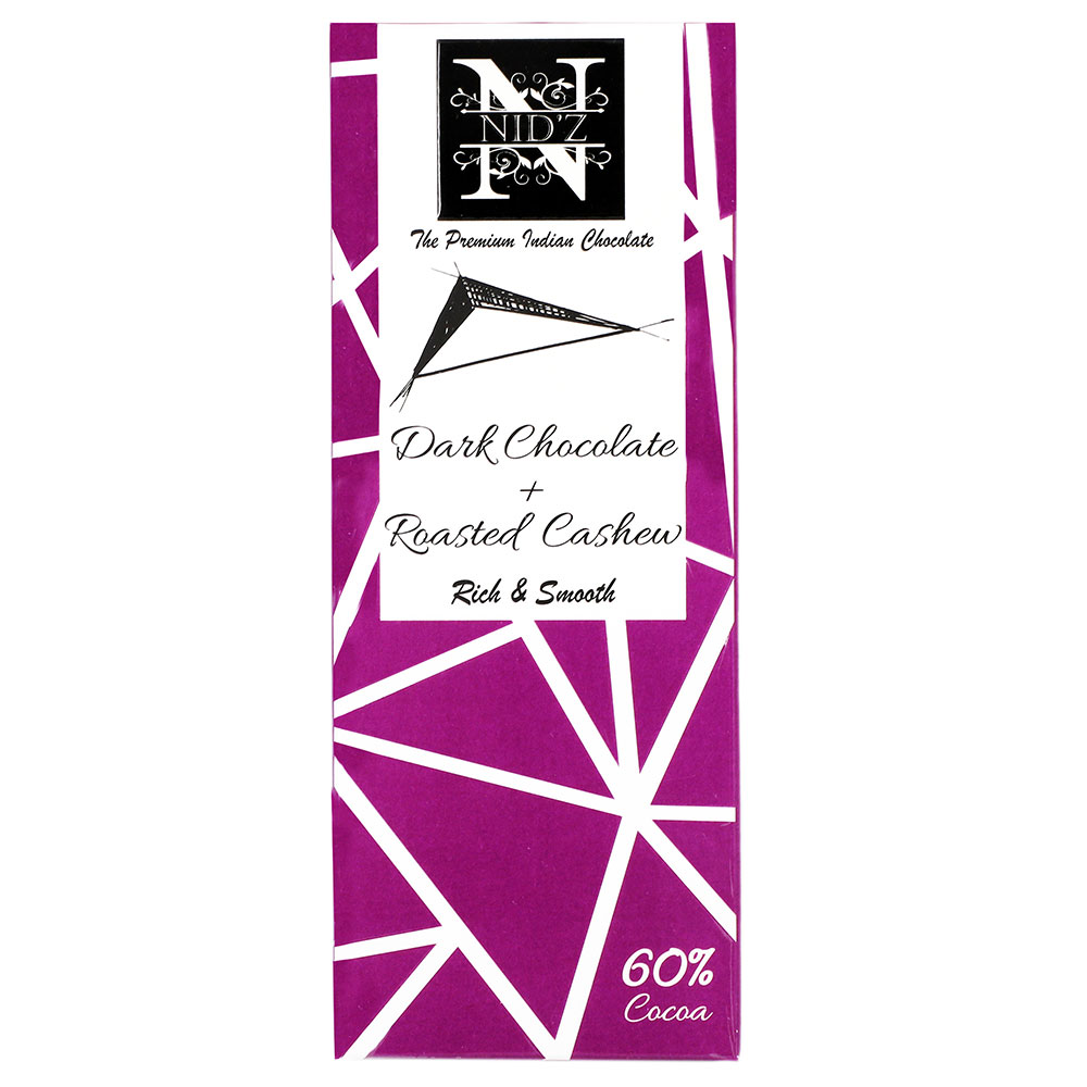 “Experience the smooth texture and delightful aroma of fine dark chocolate with crunchy roasted cashew bits.”